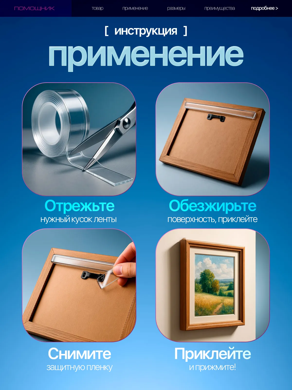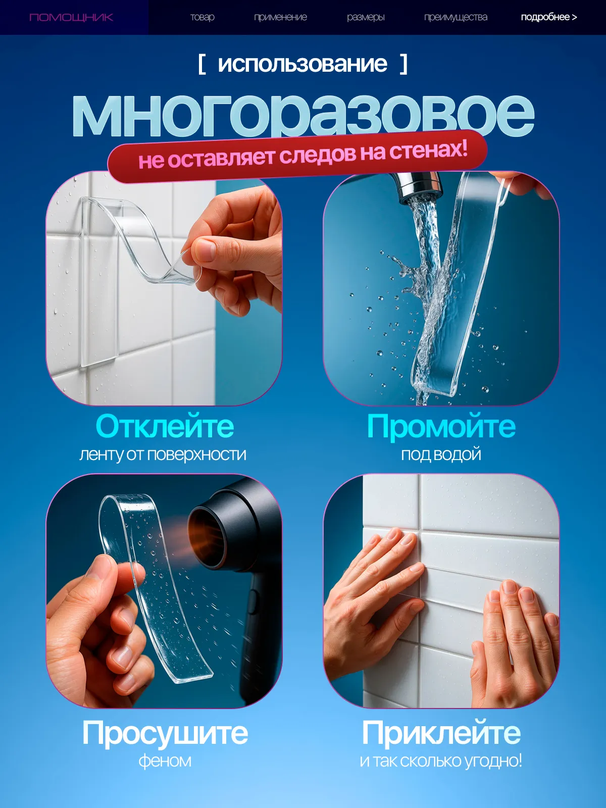 Это просто спасение для квартиры! Повесила на кухне тяжёлую навесную полку с банками — держится идеально уже полгода. Скотч абсолютно незаметен, стену сверлить не пришлось. А когда снимала временный держатель для ванной — ни следа, ни липкости. Обязательно куплю ещё, это лучший скотч из всех, что я пробовала.